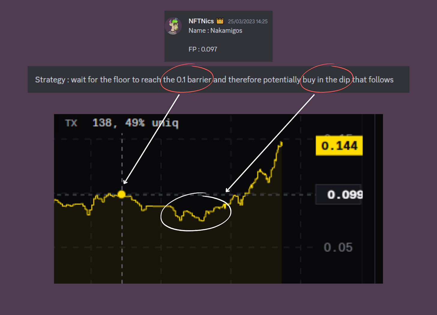 we spot a price for which there is a lot of listing above the floor price, I had for example spotted that there was a lot of listing at 0.1 ETH when the floor price was at 0.092. This usually means that it will be a small top